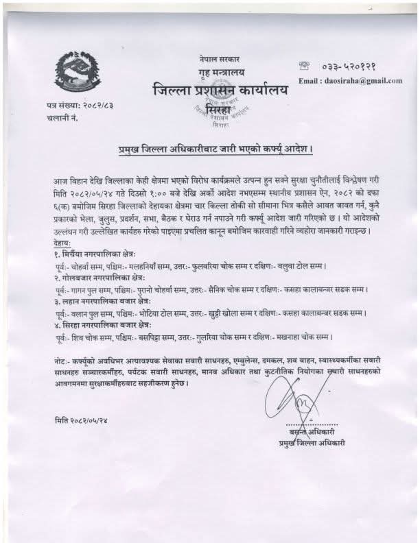 सिरहा, २४ भदौ। जिल्ला प्रशासन कार्यालय सिरहाले मंगलबार दिउँसो १ बजेदेखि लागू हुने गरी जिल्लाका चारवटा नगरपालिकाका केही क्षेत्रमा अनिश्चितकालीन कर्फ्यु आदेश जारी गरेको छ।
