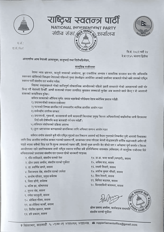 काठमाडौं, २४ भदौ। राष्ट्रिय स्वतन्त्र पार्टी (रास्वपा) का २० जना सांसदले सामूहिक राजीनामा दिएका छन्। जेनजी पुस्ताद्वारा सुरु गरिएको शान्तिपूर्ण आन्दोलनमाथि सरकारले गरेको दमन र दर्जनौं युवाको ज्यान गएपछि रास्वपाले यस्तो कदम चालेको हो।