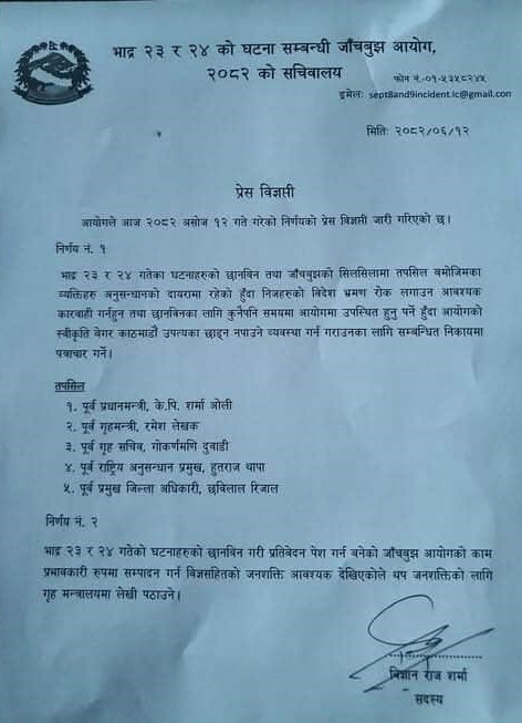 आयोगले हालसम्म आन्दोलनका क्रममा भएको घटनामा संलग्न व्यक्तिहरूको तथ्य खोजी तथा प्रमाण संकलनलाई प्राथमिकतामा राख्दै छानबिन अगाडि बढाएको जनाएको छ।