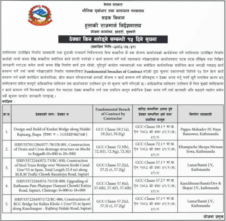सडक डिभिजन कार्यालय विराटनगर, चन्द्रनिगाहपुर तथा निर्देशनालयले पाँच/पाँच र नुवाकोटले २ वटा गरी १७ वटा ठेक्का किन नतोड्ने ? भन्दै शुक्रबार सार्वजनिक सूचना जारी गरेका छन् । ठेका तोड्न प्रक्रिया बढाइएका अधिकांश पुल निर्माणका रहेका छन् ।
