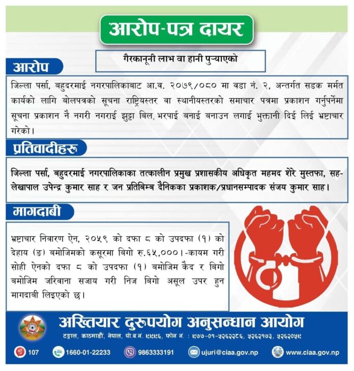 राैतहट, ०९पुस । राैतहटकाे देवाही गाेनाही नगरपालिकाका प्रमुख प्रशासकिय अधिकृत महमद शेरे मुस्तफालाई भ्रष्टाचार मुद्दा दायर भएकाे छ । उक्त प्रकरणमा मुख्य प्रतिवादीका रूपमा रहेका महमद शेरे मुस्तफा हाल रौतहट जिल्लाको देवाही गोनाही नगरपालिकामा प्रमुख प्रशासकीय अधिकृतको जिम्मेवारी सम्हालि रहेका छन ।
