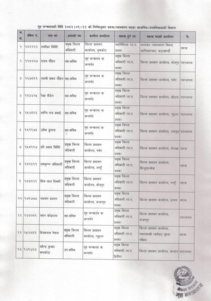 मन्त्रालयले केहि दिन अघि विभिन्न मन्त्रालयबाट सरुवा भएर गृह मन्त्रालय भित्रिएका ७ जना सहसचिवमध्ये ६ जनालाई विभिन्न जिल्लाको प्रमुख जिल्ला अधिकारीको जिम्मेवारी दिएको छ भने सहसचिव शशिकुमार घिमिरेले कारागार व्यवस्थापन विभागको महानिर्देशकको जिम्मेवारी दिएको छ ।