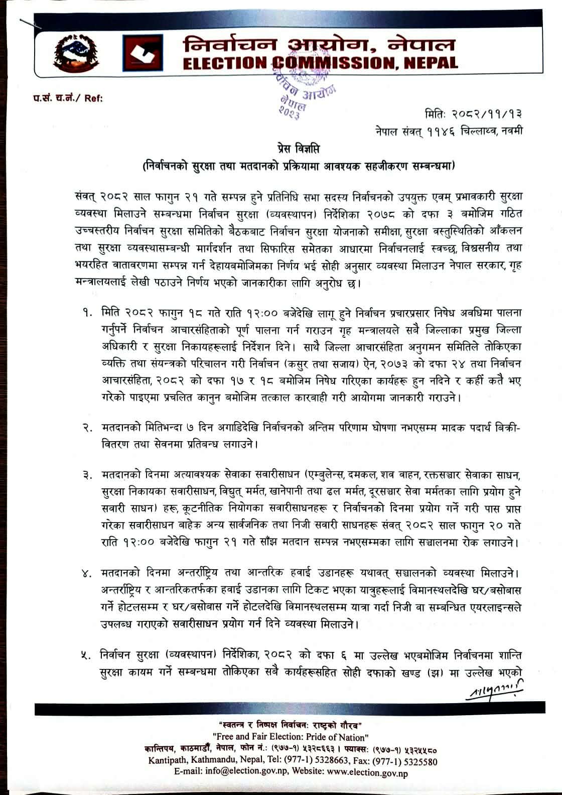 १.फागुन २१ गते सम्पन्न हुने प्रतिनिधि सभा सदस्य निर्वाचनको उपयुक्त एवम् प्रभावकारी सुरक्षा व्यवस्था मिलाउने सम्बन्धमा निर्वाचन सुरक्षा (व्यवस्थापन) निर्देशिका २०७८ को दफा ३ बमोजिम गठित उच्चस्तरीय निर्वाचन सुरक्षा समितिको बैठकबाट निर्वाचन सुरक्षा योजनाको समीक्षा, सुरक्षा वस्तुस्थितिको आकलन तथा सुरक्षा व्यवस्थासम्बन्धी मार्गदर्शन तथा सिफारिस समेतका आधारमा निर्वाचनलाई स्वच्छ, विश्वसनीय तथा भयरहित वातावरणमा सम्पन्न गर्न देहायबमोजिमका निर्णय भई सोही अनुसार व्यवस्था मिलाउन नेपाल सरकार, गृह मन्त्रालयलाई लेखी पठाउने निर्णय भएको जानकारीका लागि अनुरोध छ ।