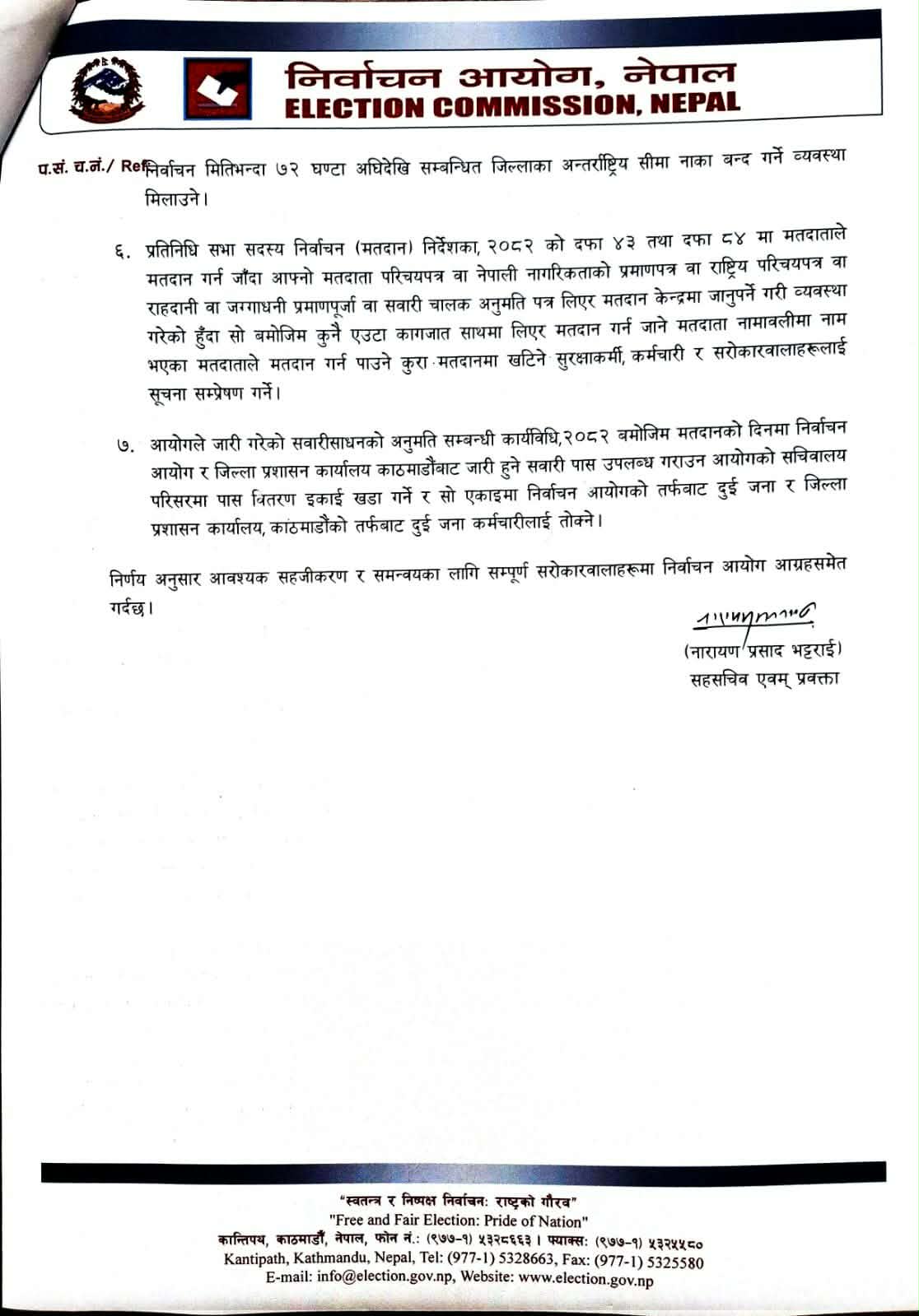 ६. प्रतिनिधि सभा सदस्य निर्वाचन (मतदान) निर्देशका, २०८२ को दफा ४३ तथा दफा ८४ मा मतदाताले मतदान गर्न जाँदा आफ्नो मतदाता परिचयपत्र वा नेपाली नागरिकताको प्रमाणपत्र वा राष्ट्रिय परिचयपत्र वा राहदानी वा जग्गाधनी प्रमाणपूर्जा वा सवारी चालक अनुमति पत्र लिएर मतदान केन्द्रमा जानुपर्ने गरी व्यवस्था गरेको हुँदा सो बमोजिम कुनै एउटा कागजात साथमा लिएर मतदान गर्न जाने मतदाता नामावलीमा नाम भएका मतदाताले मतदान गर्न पाउने कुरा मतदानमा खटिने सुरक्षाकर्मी, कर्मचारी र सरोकारवालाहरूलाई सूचना सम्प्रेषण गर्ने।